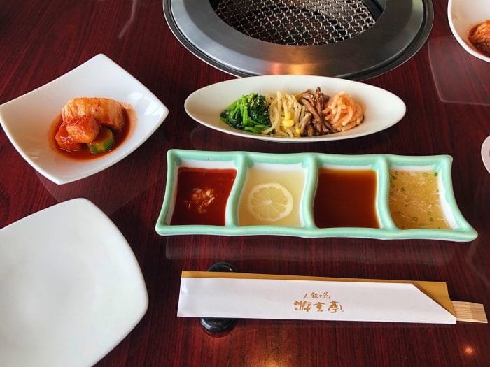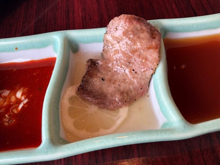 焼肉につけるタレは4種類。上の写真の左から激辛ダレ、レモンダレ、甘めタレ、ネギ塩ダレとなっています。