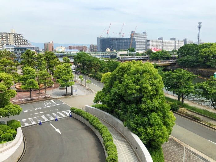 大阪城公園と大阪環状線が見えます。